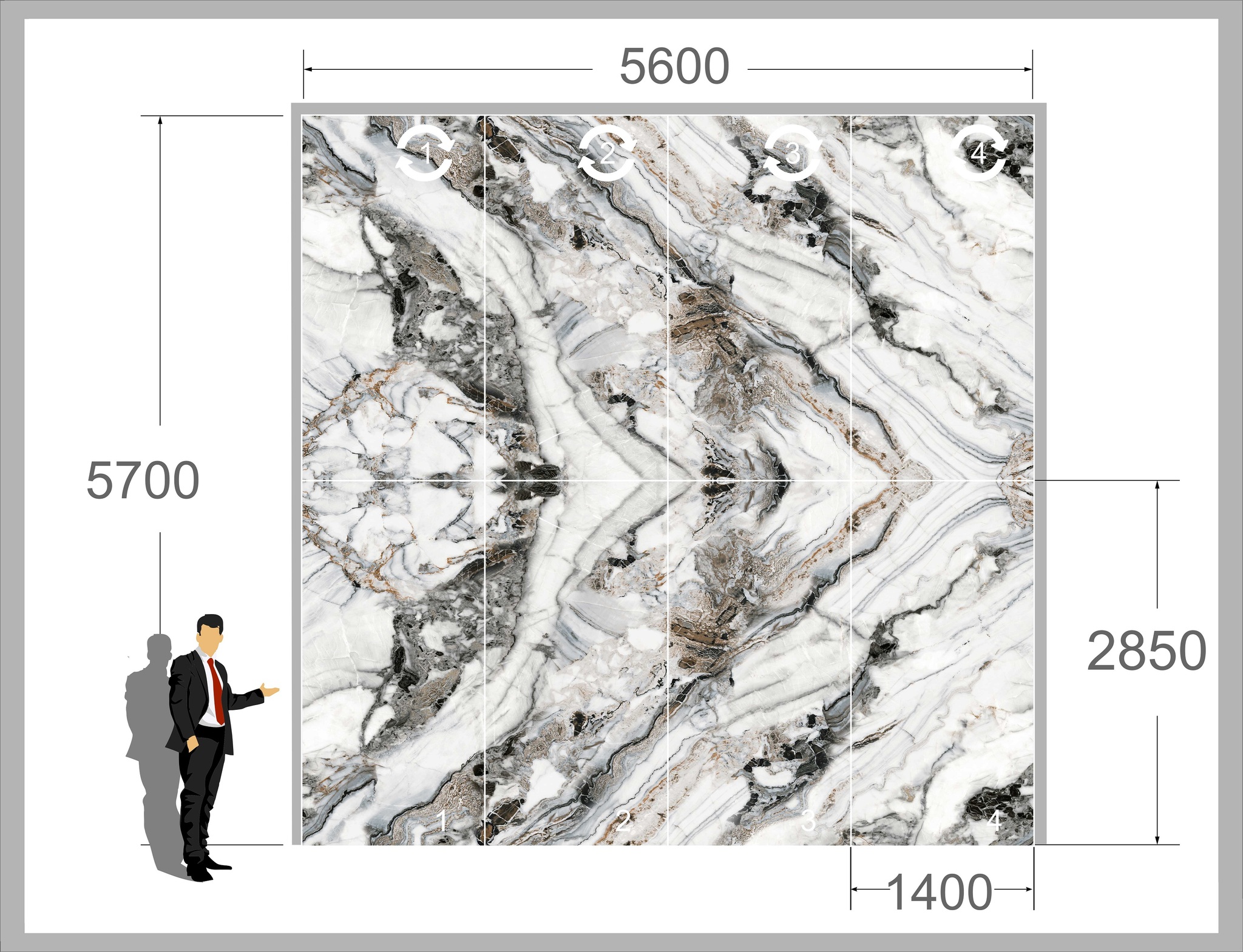 Листы гибкого мрамора из серии «ЭЛИТА» стыкуются со всех четырёх сторон, образуя единое бесшовное полотно как при горизонтальном, так и при вертикальном расположении. Это открывает удивительные возможности для дизайна, позволяя реализовать проекты любой высоты.