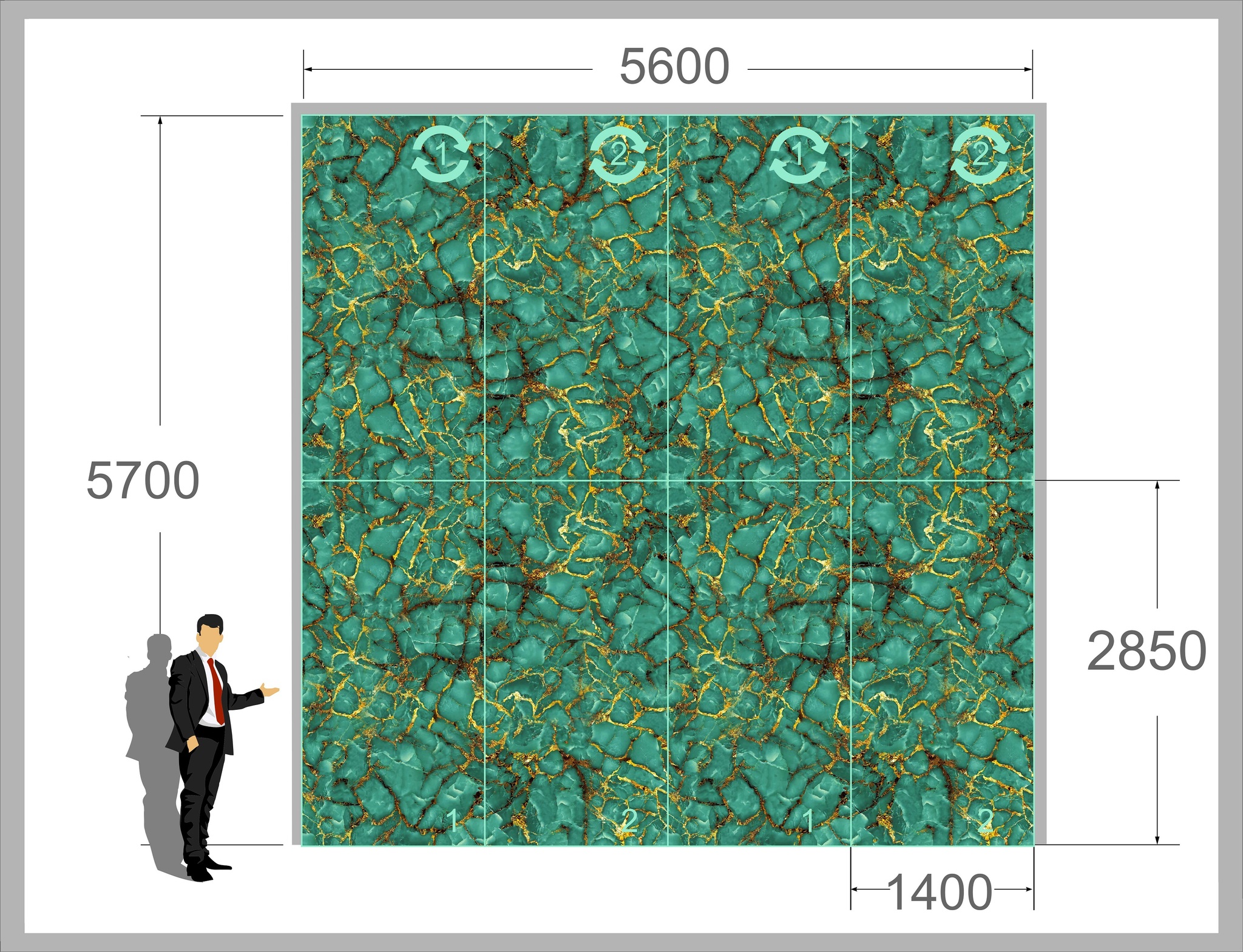 Наш гибкий мрамор, созданный с использованием современных технологий, с точностью повторяет природный узор камня, но при этом стоит гораздо меньше. При соблюдении правил укладки, вы получите целостное покрытие, которое будет выглядеть как настоящий мрамор. Например, используя четырехкратный рисунок укладки, можно создать иллюзию непрерывного мраморного орнамента.